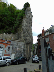 Ogólne wrażenie jednak super. Miejsce jest niesamowite. Do miasta wjeżdżaliśmy przez las, z wielkiej góry... w dół i w dół, i w dół. Po obydwu stronach drzewa, ruiny kamiennych domów, w których rozpanoszyła się już roślinność... Zabudowa i położenie miasta jest dość niecodzienne. Domy przyczepione są bezpośrednio do skały, w efekcie nad dachami nie raz zwisają występy skalne. Brrr. Tak więc tam gdzie ludzie w innych miejscowościach mają ogródki, Dinancianie (Dinandczycy) mają kamień. Hm, można i tak. Inne domy siedzą wysoko na skale (nie wiem, jak tam włażą co dnia). Z jeszcze innych można prosto z drzwi lub okien wskakiwać do łodzi.