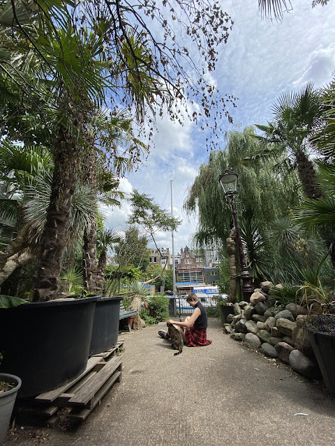 Niedaleko od Dworca Centralnego jest mini ogródek palmowy, gdzie nikogo nie było poza kotem. A kot przyszedł i usiadł przed Młodą, no więc go wygłaskała ze wszystkich stron. Adres ogródka: Prinseneiland 40, gdyby komu się nudziło w Amsterdamie.